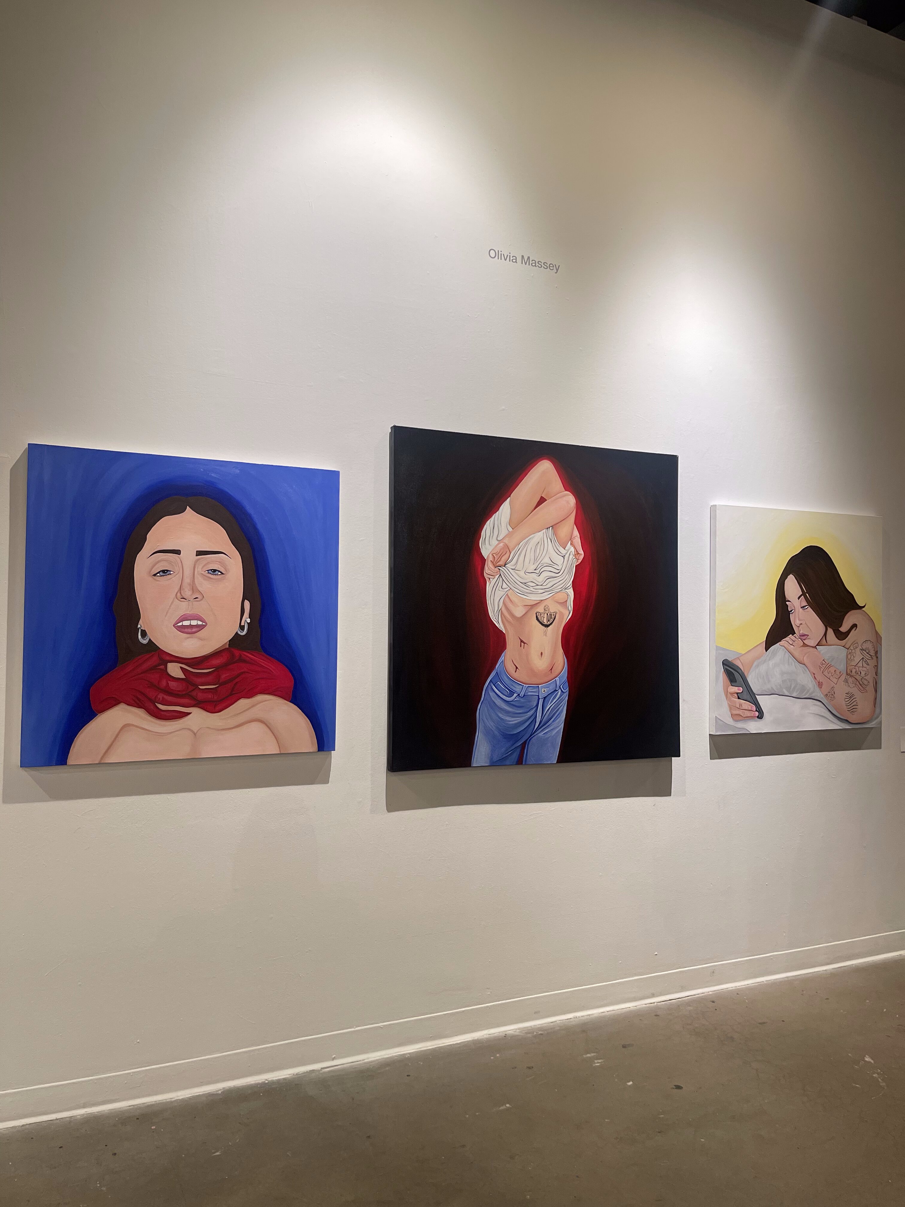 Under the soft, diffused spotlight, three portraits sit atop the white walls in heavy contrast to the bold crimson and cobalt accents on the canvas. Olivia Massey stands fearlessly in front of her grueling months-long work, and I—an especially proud friend— was excited to be attending her exhibition at the Redline Art Center. What art viewers don’t typically see is the behind-the-scenes of the artist’s creative process, and how the evolution from conception to execution is a complex one that involves thoughtful meditations. For Massey, this is fitting for her thesis ‘The Art of Introspection’. I had the pleasure of sitting in on the process, from photographing her inspiration pictures to discussing and visiting the in-progress canvases in her basement studio. The ideation of her brainchild became all-consuming, with a period of incubation and bouts of uncertainty and redirection. The artistic process, as we know, is non-linear. It ebbs and flows much like our emotions, and requires a wakening of the subconscious. Then comes the motivation to transform a mere idea into palpable substance. When the portraits received their final gloss, a powerful statement was born.
